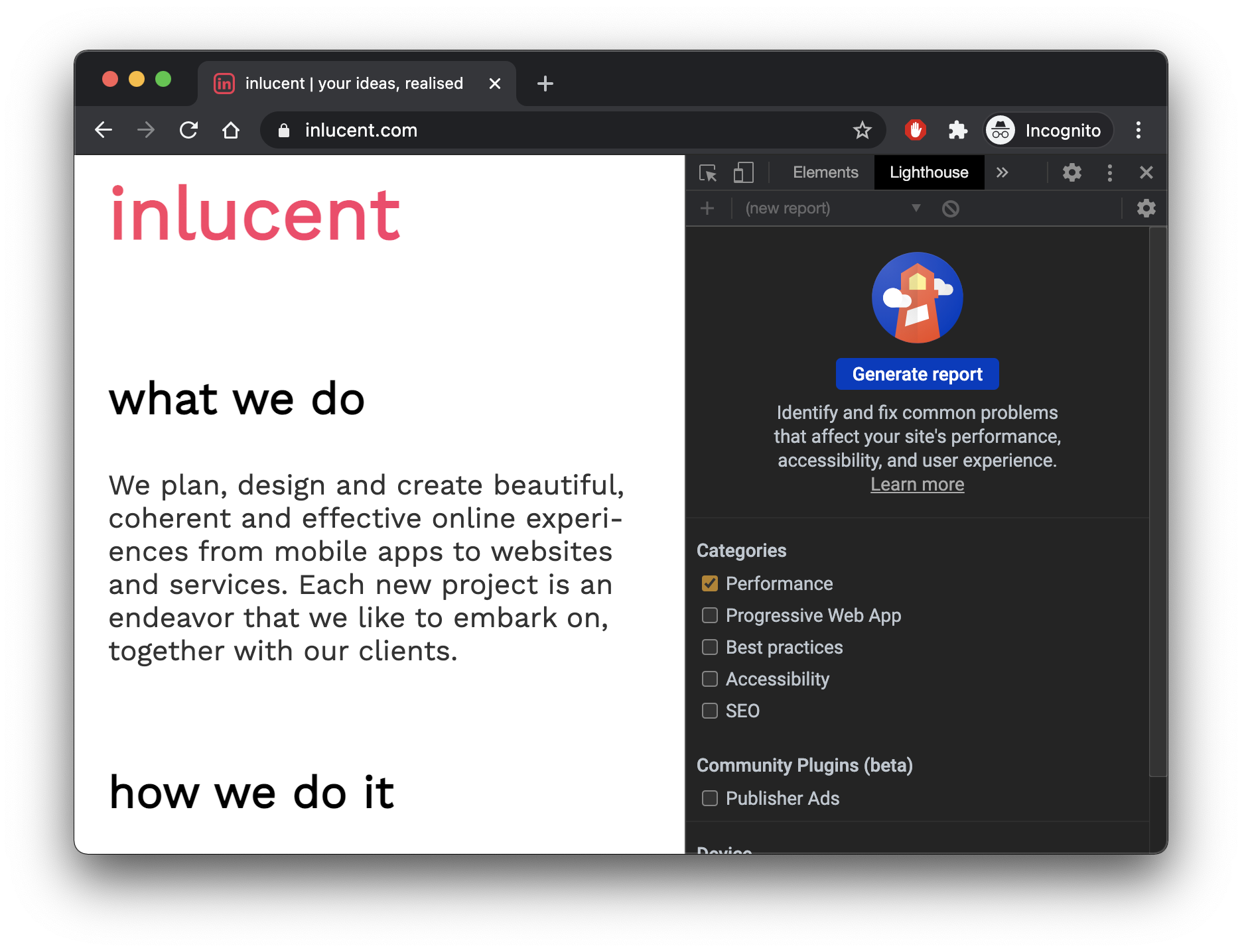 The next step is to find the Lighthouse tab within Developer Tools and then make sure there is a ticked checkbox next to Performance.
