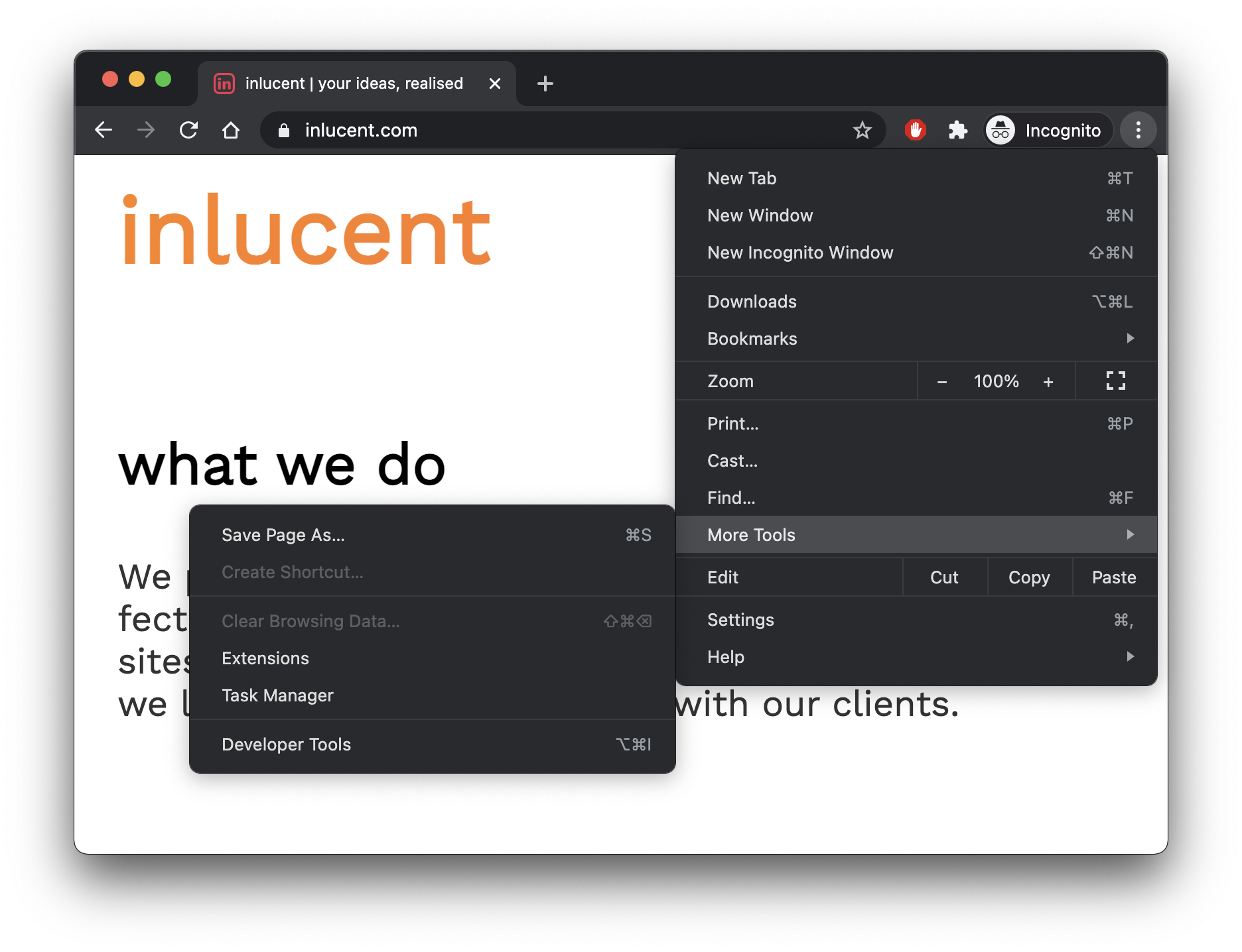 To access Lighthouse, you will need to open Developer Tools in Chrome. To do this you can click the ... icon in the top right corner of your Chrome window and find More Tools submenu, where you will click the Developer Tools option, which will open up the Developer Tools window.